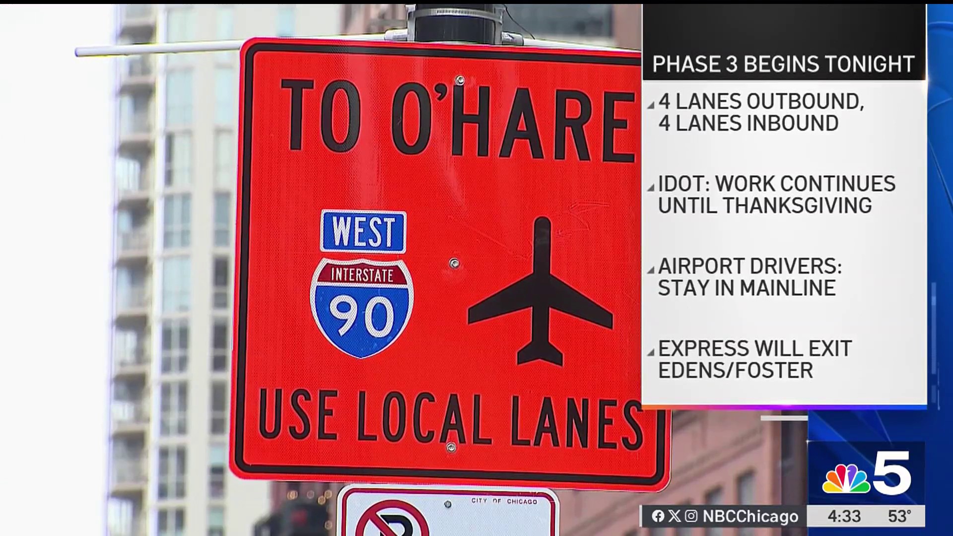 The lanes will reopen in stages, IDOT says, with lane shifts and closures overnight Wednesday, Thursday, Friday and Saturday as the work zone is removed. Early Wednesday morning, the lane shifts were causing some congestion and backups on the outbound side, NBC 5 traffic reporter Kye Martin said.