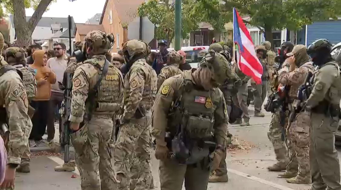 Video captured the moment a heavy federal presence was seen at a Chicago intersection, with armed agents, many masked or wearing gas masks, met by a large crowd in the city’s East Side neighborhood.