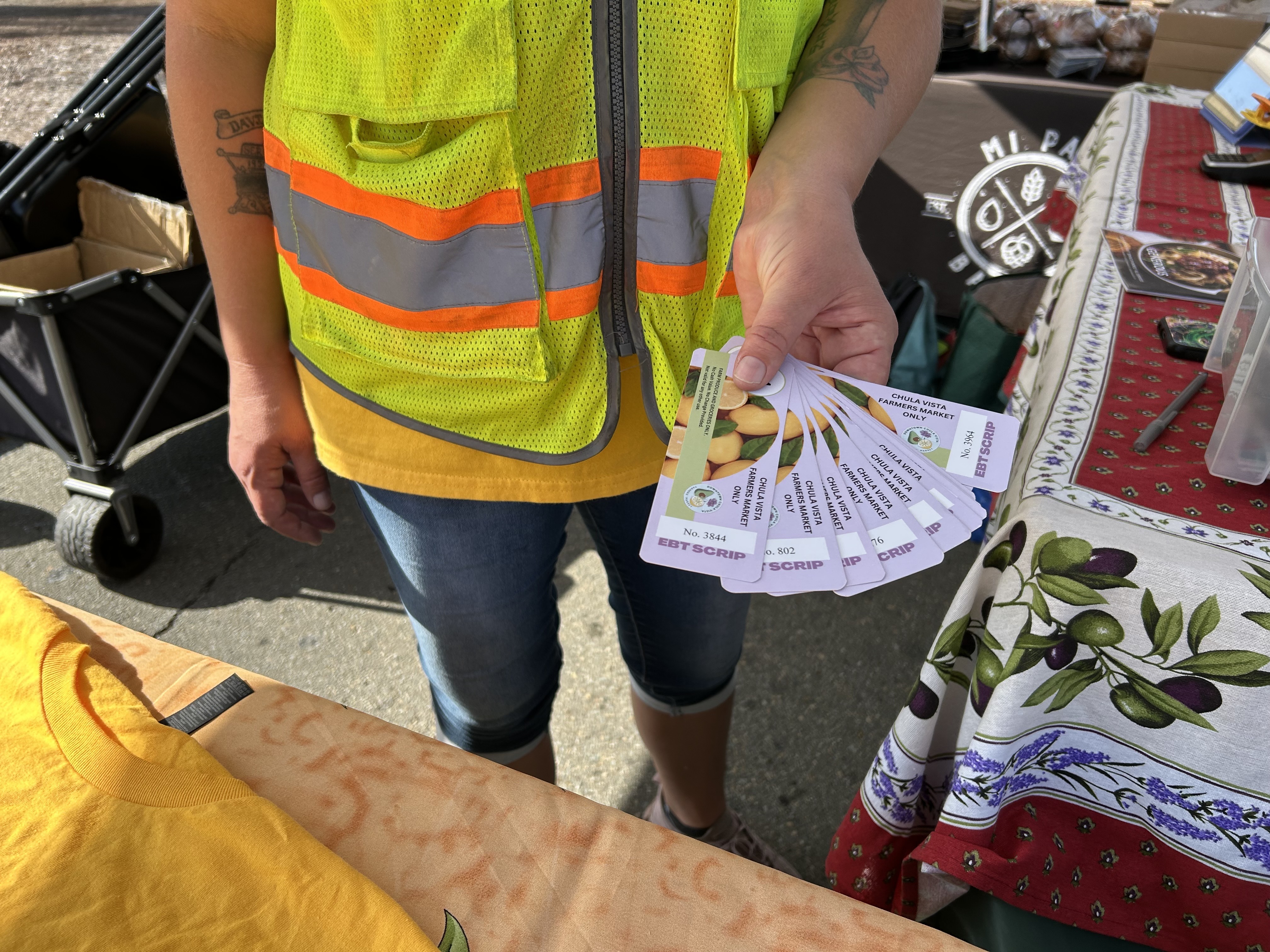 Tristan McCall is the on-site market manger in Chula Vista on Sundays. She showed the EBT coupons SNAP recipients use to buy fresh produce, November 9, 2025.