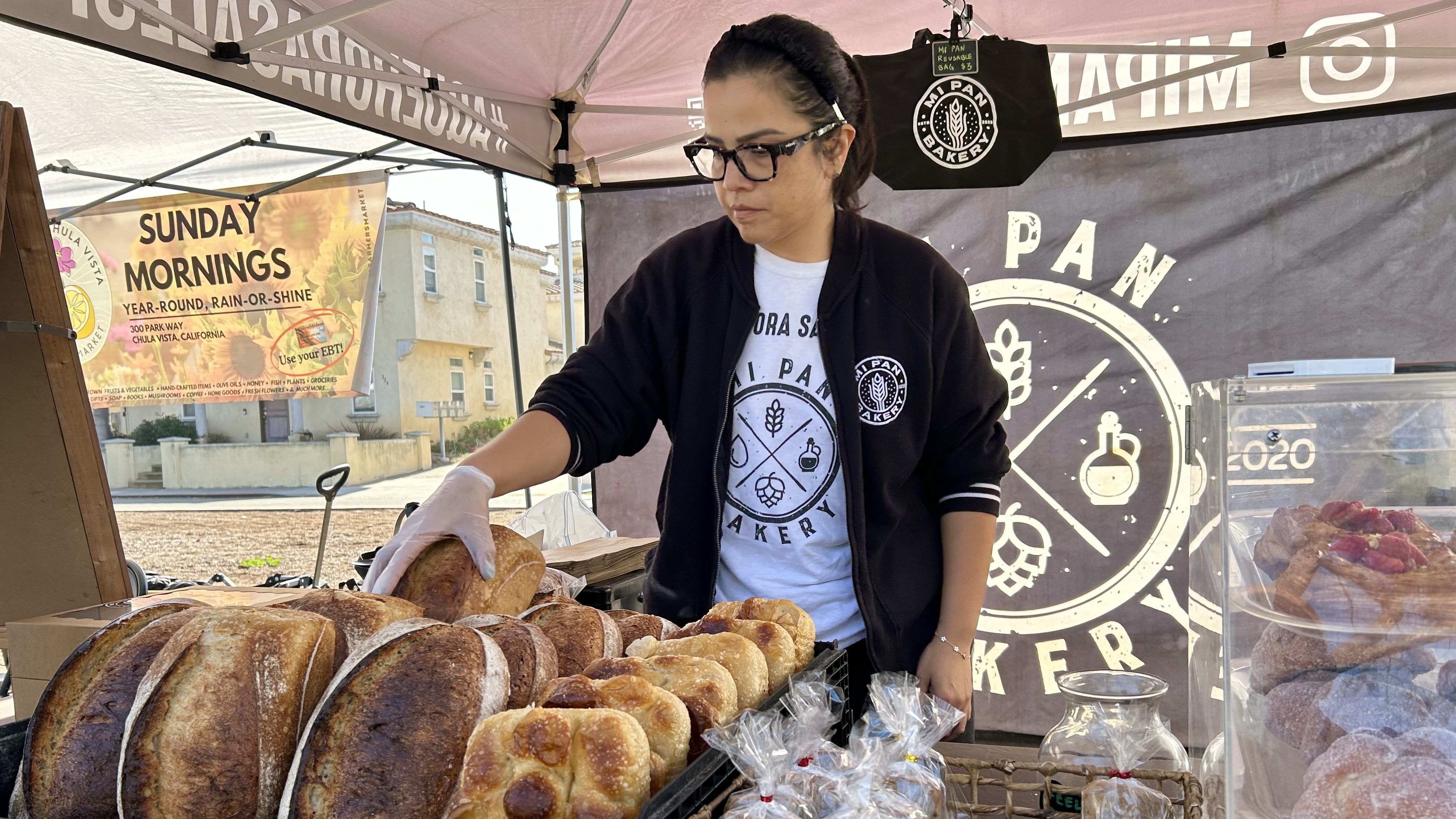 Alejandra Ruelas sells homemade bread and pastries every Sunday at the Chula Vista Farmers’ Market. All of it baked by her husband in their home kitchen.