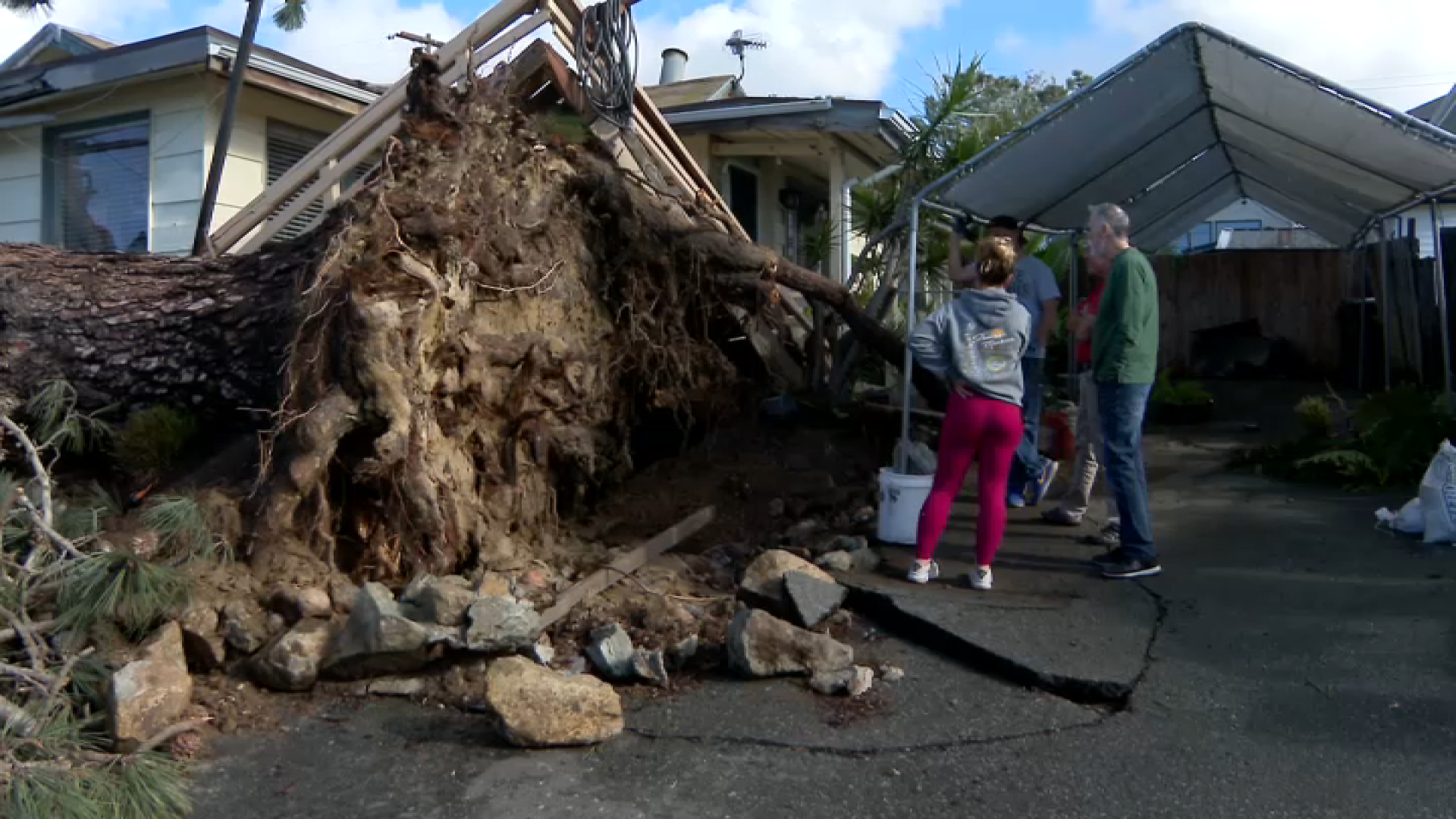 The neighborhood is usually known for its ocean views, but Wednesday morning all eyes were on the destruction caused when a towering Torrey pine crashed down during the storm.
