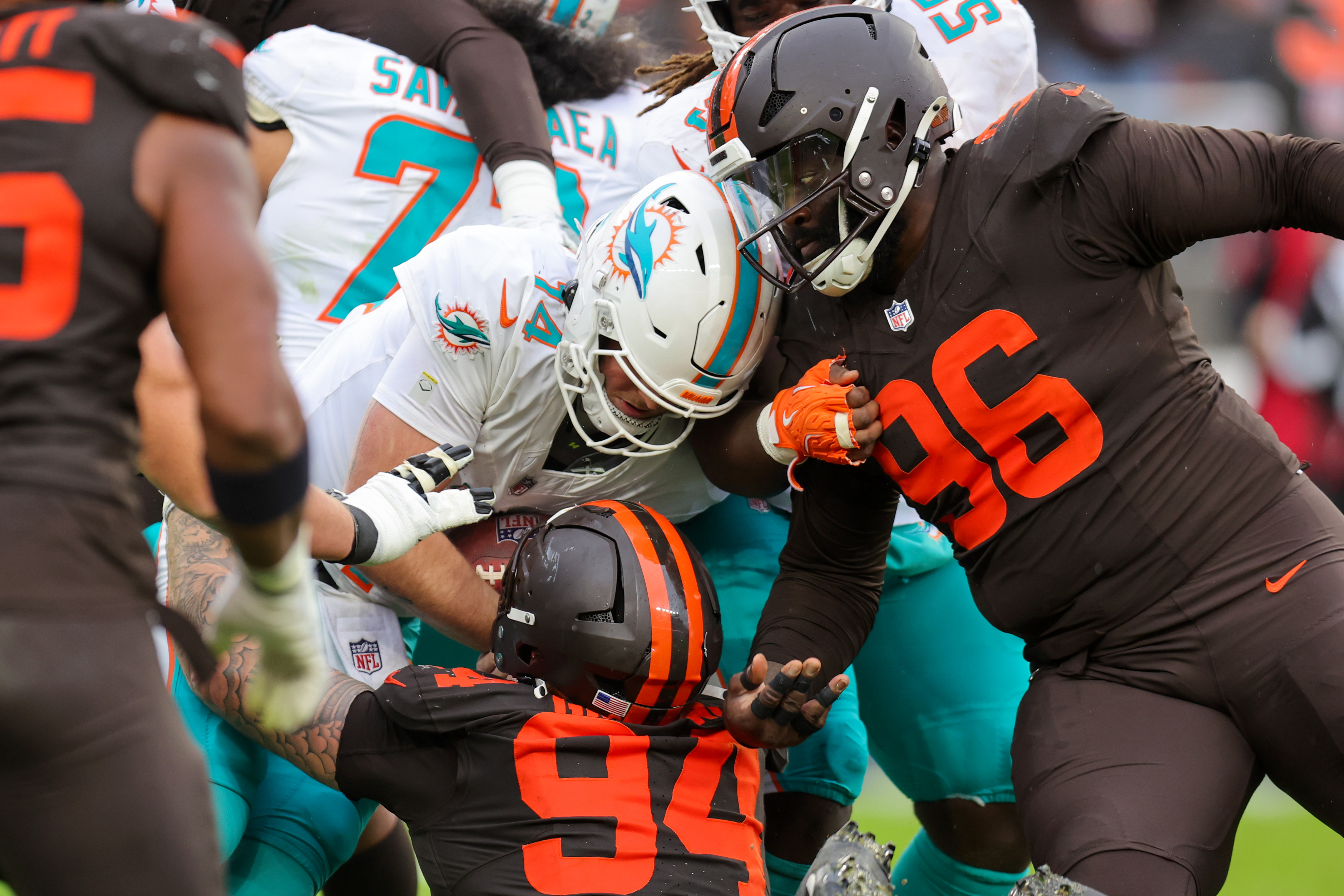 CLEVELAND, OH – OCTOBER 19: Miami Dolphins quarterback Quinn Ewers (14) is tackled by Cleveland Browns defensive tackle Mason Graham (94) and Cleveland Browns defensive tackle Maliek Collins (96) after receiving his own fumble during the fourth quarter of the National Football League game between the Miami Dolphins and Cleveland Browns on October 19, 2025, at Huntington Bank Field in Cleveland, OH. (Photo by Frank Jansky/Icon Sportswire via Getty Images)