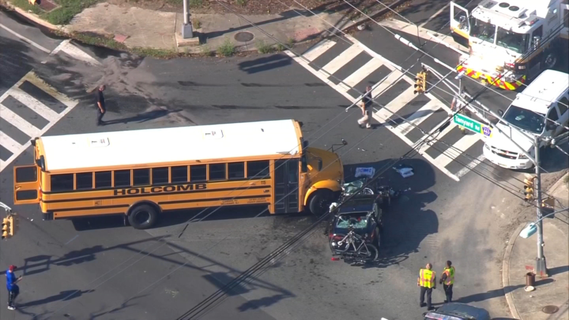 A crash involving a school bus and a sedan has an intersection shut down in South Jersey on Thursday afternoon.