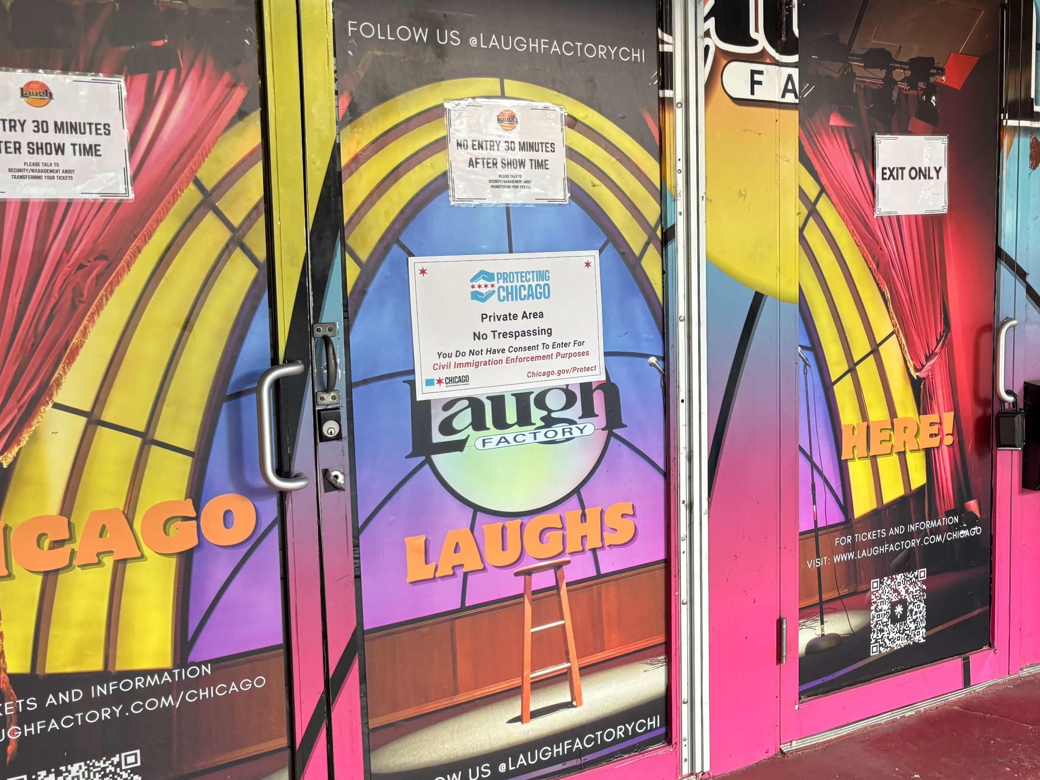 A sign on the entrance to Laugh Factory says, “Private Area No Trespassing You Do Not Have Consent To Enter For Civil Immigration Enforcement Purposes.”