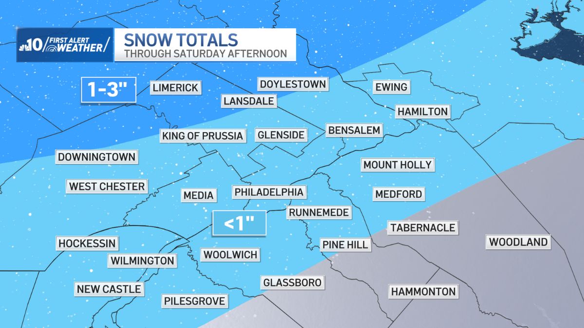 You’ll have a better chance of seeing 3 inches of snow the farther north you go but closer to 1 inch of snow near Downingtown, King of Prussia, Lansdale and Doylestown.