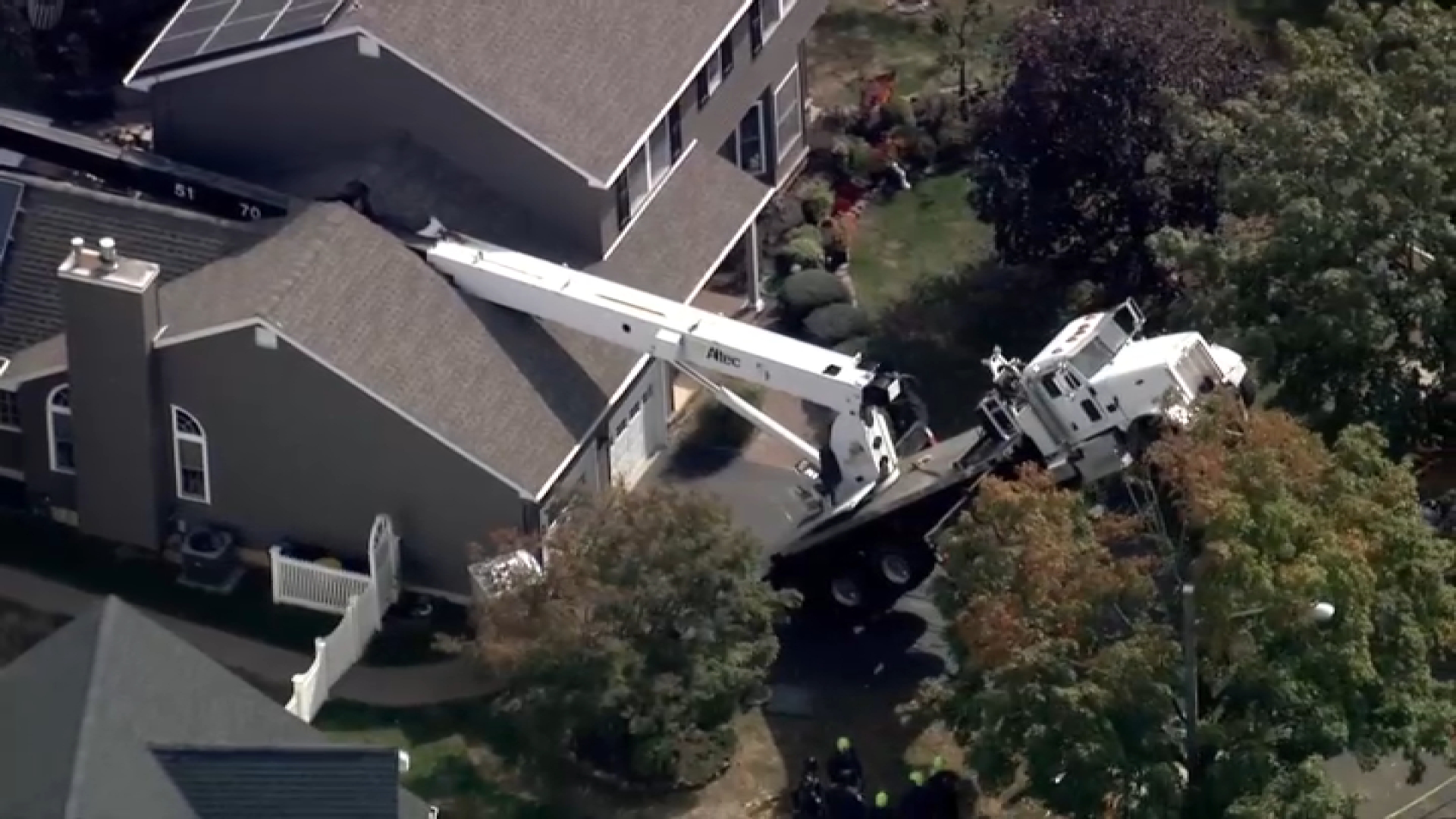 A crane from a truck crashed on top of a large home in Hamilton Township, Mercer County, New Jersey.