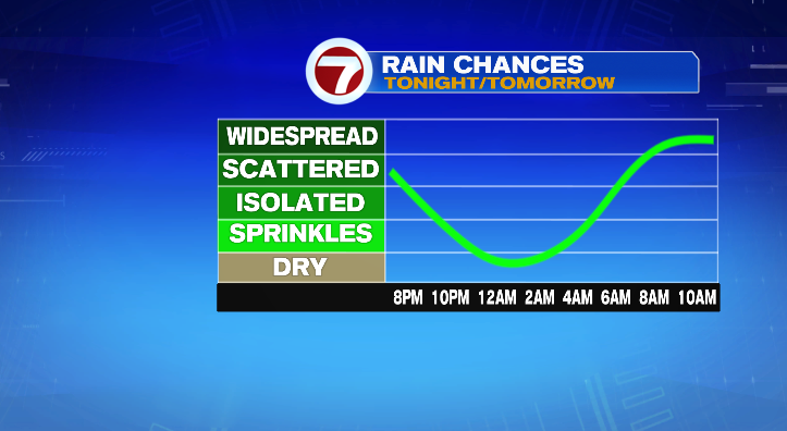 Because of the rain and heavy cloud cover, temperatures will barely budge overnight. Lows will only drop to the upper 40s and low 50s. Rain showers will be widespread Sunday evening but will dwindle to just an isolated light shower overnight.