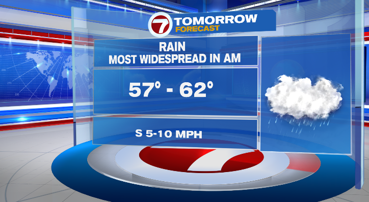 Most of it will be light with pockets of moderate to heavy rainfall. Plan extra time for your commute! Monday afternoon, the rain will break back up to just isolated light showers. Highs will be mild in the upper 50s and low 60s. It won’t be too windy, so an umbrella should be fine.
