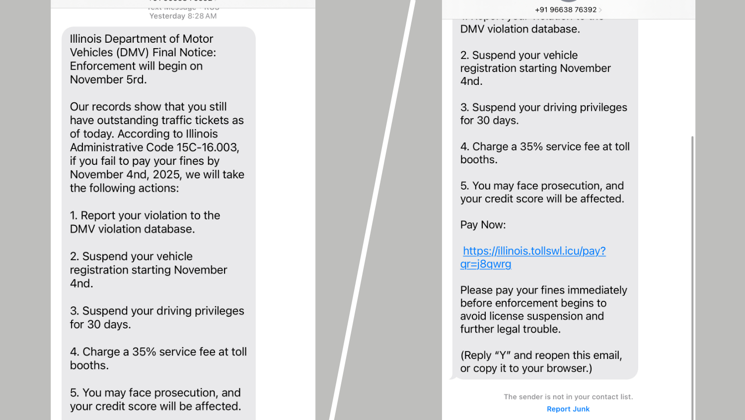 “Illinois Department of Motor Vehicles (DMV) Final Notice: Enforcement will begin on November 5rd,” the text begins. The text goes on to also give a “failure to pay” date by “November 4nd.”
