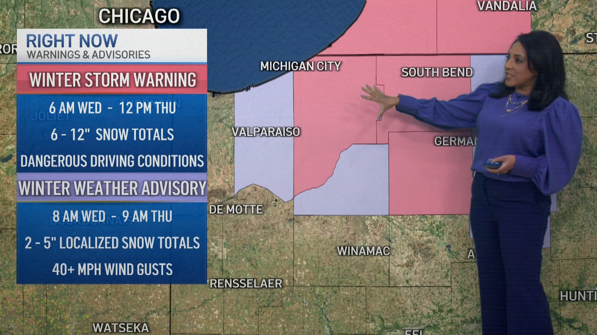 In Illinois, snowfall was expected to end in the late morning hours, NBC 5 Storm Team Meteorologist Alicia Roman said. In northwest Indiana, it would continue through Thursday afternoon, with the National Weather Service warning of major travel impacts.