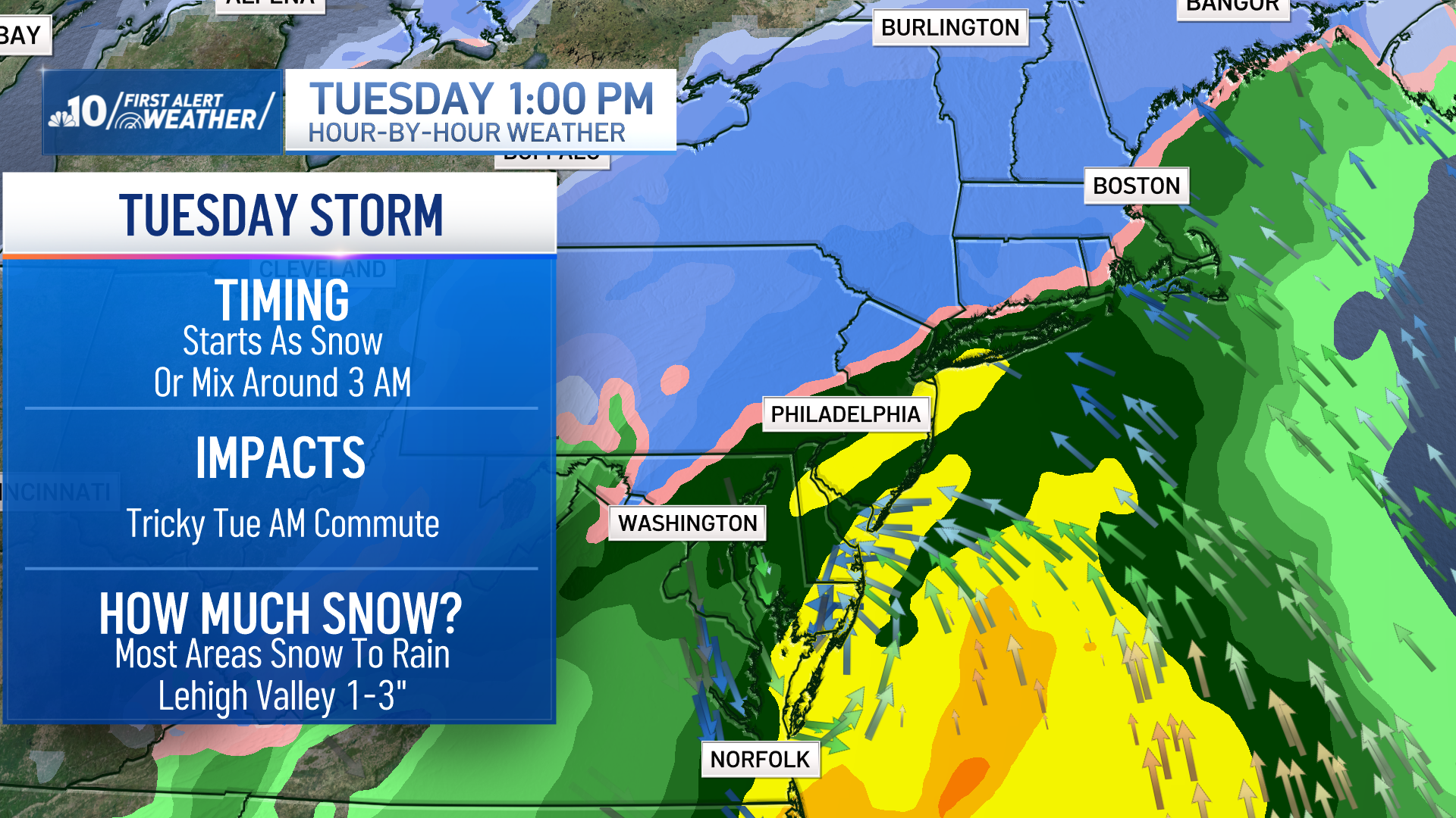Because the system is coming in later and warmer than earlier forecasts suggested, snow totals have trended down with meaningful accumulation now most likely north of Interstate 78 and in the higher elevations of the Poconos.