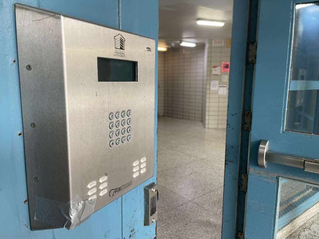 Residents say a broken intercom at Surfside Gardens’ Building 3 has left the front door propped open for years, raising safety concerns and leading to stolen packages. (Photo by Bella Week)